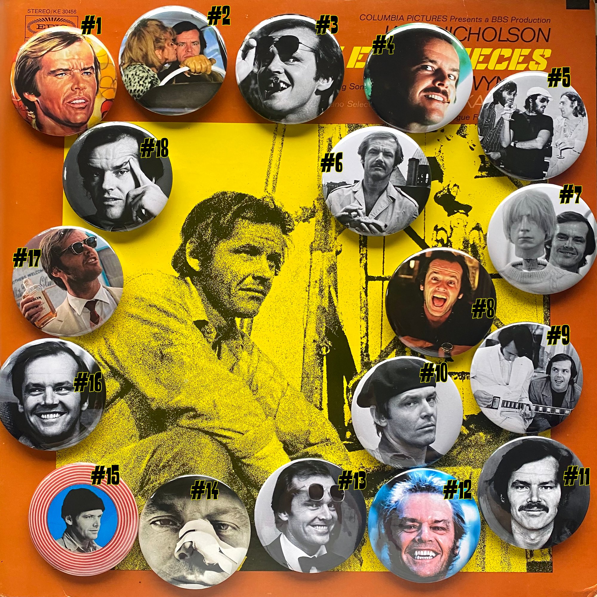 A super fab 18-piece button collection dedicated to thee movie star of all movie stars Jack Nicholson!